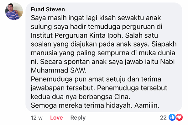 Rasulullah SAW bersabda: “Tidak beriman seseorang daripada kami sehingga aku lebih dikasihi oleh kamu berbanding dengan anak-anak, kedua ibu bapa dan manusia yang lainnya.” (Hadis Riwayat al-Bukhari dan Muslim)